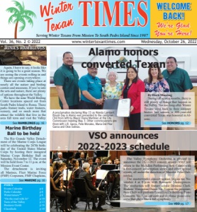 Winter Texan TIMES Serving Winter Texans FromMission To South Padre Island Since 1987 Vol. 36, No. 2 © 2022 www.wintertexantimes.com Wednesday, October 26, 2022 INDEX Events Calendar p 6 Parks Calendar p 8 WintertainersTM p 8 “On the road with Jo” p 10 Taste of the Valley p 13 Business Guide p 16 Classifieds p 18 Rina’s Ramblings The Valley Symphony Orchestra is pleased to announce the 2022-2023 concert season. VSO will return to the McAllen Performing Arts Center with a five-concert subscription series and other special events, all under the direction of Maestro Peter Dabrowksi. The masterworks concert season begins on November 4 at 8 p.m. with Romantic Masterpieces. The production will feature soloist Dominic Cheli. Brahms’ Hungarian Dance No. 5 opens the program; then Cheli will perform Franz Liszt’s dazzling Piano Concerto No. 1, an intricate and rhythmic piano concerto that plays like a full symphony. See VSO pg. 17 See RAMBLINGS pg. 16 See MARINE pg. 16 Again, I have to say, it looks like it is going to be a great season. We are seeing the events rolling in and things are opening everywhere. There are events taking place at nearly all the nature and birding centers and museums. If you’re into the arts and nature, there are plenty of options throughout the Valley. We have the nine World Birding Center locations spaced out from South Padre Island to Roma. These parks feature trails, water features, scenery, and so much more that attract the wildlife that live in the area full term and visit the Valley A proclamation declaring May 15 as Wanda Lambert Boush Day in Alamo was presented to the centurian (3rd from left) by Mayor Diana Martinez at the City Commission meeting May 3. Other commissioners are (from left) J.R. Garza, Pete Morales, Maria Del Pilar Garza and Okie Salinas. WELCOME BACK! We’re Glad You’re Here! VSO announces 2022-2023 schedule The Rio Grande Valley Detachment of the Marine Corps League will be celebrating the 247th birthday of the United States Marine Corps by hosting their inaugural Marine Corps Birthday Ball on Saturday, November 12. The event will be held from 7 to 11 p.m. at the Mission Event Center. The detachment is inviting all Marines, Fleet Marine Force (FMF) Corpsmen, FMF Chaplains, Marine Birthday Ball to be held Alamo honors converted Texan By Herb Moering During off season months, there is still plenty of things that happen in the Valley. Not too long after Winter Texans went back to their summer homes last season, a 100-year-old converted Texan was honored in Alamo. See HONORS pg. 12