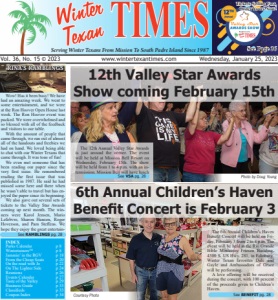 Winter Texan TIMES Serving Winter Texans FromMission To South Padre Island Since 1987 Vol. 36, No. 15 © 2023 www.wintertexantimes.com Wednesday, January 25, 2023 INDEX Parks Calendar p 8 WintertainersTM p 8 Jammin’ in the RGV p 18 From the Cheap Seats p 20 On the road with Jo p 22 On The Lighter Side p 24 Reunions p 26 Events Calendar p 27 Taste of the Valley p 29 Business Guide p 33 Classifieds p 33 Coupon Index p 34 Rina’s Ramblings See RAMBLINGS pg. 28 Wow! Has it been busy! We have had an amazing week. We went to some entertainment, and we were at the Ron Hoover Open House last week. The Ron Hoover event was packed. We were overwhelmed and so blessed with all of the feedback and visitors to our table. With the amount of people that came through, we ran out of almost all of the handouts and freebies we had on hand. We loved being able to chat with our Winter Texans that came through. It was tons of fun! We even met someone that has been reading our paper since the very first issue. He remembered reading the first issue that was published in 1987. He said he had missed some here and there when he wasn’t able to travel but has enjoyed the paper since its beginning. We also gave out several sets of tickets to the Valley Star Awards coming up next month. The winners were Karol Jensen, Mario Lefebvre, Sharon Hansen, Roger Hoverson, and Pam Steffens. We hope they enjoy the great entertainThe 12th Annual Valley Star Awards is just around the corner. The event will be held at Mission Bell Resort on Wednesday, February 15th. The show will be held from 1 to 4 p.m. with an intermission. Mission Bell will have lunch See VSA pg. 28 12th Valley Star Awards Show coming February 15th The 6th Annual Children’s Haven Benefit Concert will be held on Friday, February 3 from 2 to 4 p.m. The event will be held at the Rio Grande Bible Ministries Friesen Building, 4300 S. US Hwy. 281, in Edinburg. Winter Texan favorites Dale and Gayle and Ambassadors of Grace will be performing. A love offering will be received during the concert, with 100 percent of the proceeds given to Children’s Haven. See BENEFIT pg. 28 6th Annual Children’s Haven Benefit Concert is February 3 Tickets Selling Fast, Order Yours Now! See Page 36 Courtesy Photo Photo by Doug Young