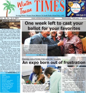 Winter Texan TIMES Serving Winter Texans FromMission To South Padre Island Since 1987 Vol. 36, No. 16 © 2023 www.wintertexantimes.com Wednesday, February 1, 2023 INDEX Parks Calendar p 8 WintertainersTM p 8 Reunions p 14 Jammin’ in the RGV p 18 Events Calendar p 19 From the Cheap Seats p 20 On the Road with Jo p 22 On The Lighter Side p 24 Taste of the Valley p 25 Business Guide p 27 Classifieds p 29 Coupon Index p 30 Rina’s Ramblings See RAMBLINGS pg. 24 Oh Boy! This weather is crazy! We have had such nice weather and then boom, it gets a little chilly again. But… good things are in store. It should be nice this weekend though. Nice enough to enjoy some time outside at the SPI Kite Fest. We plan to be out at the Island on Thursday, and possibly Friday as well. We have never been to an indoor kite show. So, we are looking forward to that. There are tons of things going on for our Winter Texans right now. There is the Kite Fest, a car show, entertainment at parks, a Gospel Fest, museum exhibits, and so much more. Our Reunions and Meetings section keeps receiving more entries too. Make sure you check all of those items out – the Parks Calendar, Events Calendar, and Reunions and Meetings. Don’t forget the ads in our Wintertainers™ section located under the Parks Calendar. Those are parks and Wintertainers™ that advertise their events, sometimes several Ballots for the Valley Star Awards are rolling in. If you want to make sure your voice is heard, you need to vote for your favorite Wintertainers™. This year’s categories are Male Vocalist of the Year, Female Vocalist of the Year, Duet MusiSee VSA pg. 23 One week left to cast your ballot for your favorites Born of new Winter Texan’s frustration, Alamo Rec-Veh Park in Alamo, Texas, will again host a unique Winter Texan Business & Health Expo on Saturday, February 4 from 10 a.m. to 1 p.m. “Because we’re here for so few winter months, most Winter Texans face the same dilemma Dennis and I did several years ago,” Expo organizer Barb Zanetti said. “Our problem? How do we replace the quality support system we’ve developed over the years in Michigan? … The doctors, contractors, repairmen, restaurants, dentists, surgeons, income tax providers, butchers, and dog groomSee EXPO pg. 16 FINDING SOLUTIONS FOR WINTER TEXANS: An expo born out of frustration Last week to vote See Page 13 Answering questions about Dr. Raul Marquez’s unique method of knee replacement requires an in-depth understanding of how the surgeon can ensure success and a quick recovery. His representatives enjoy the challenge of sharing his methods. Photo by Dennis Zanetti Photo by Henry Miller