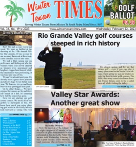 Winter Texan TIMES Serving Winter Texans FromMission To South Padre Island Since 1987 Vol. 36, No. 19 © 2023 www.wintertexantimes.com Wednesday, February 22, 2023 INDEX Parks Calendar p 9 WintertainersTM p 9 Jammin’ in the RGV p 16 On the Road with Jo p 18 Events Calendar p 19 On The Lighter Side p 20 Reunions p 21 Taste of the Valley p 23 Business Guide p 25 Classifieds p 25 Coupon Index p 26 Rina’s Ramblings See RAMBLINGS pg. 21 Boy! We had a crazy week last week. We were so thrilled at the showing at the 12th Annual Valley Star Awards. It was so nice to see so many faces out at the event, some familiar, a lot of new ones. We had a blast seeing our six performers and finding out who the winners were. The crowd cheered as winners were announced and laughed, clapped and danced while the entertainers were performing. It was loud and tons of fun. We can’t wait until next year. We already have a great show planned and always hope we do better each year. We learn as we go and hope that we only get bigger each year. On to other things…. We have enjoyed the season so far and there isn’t much of it left. It’s amazing how fast the season has gone. Now we are starting our golf course contest. We invite all of our golfers to participate in this. We know how much you enjoy playing golf while in the Valley and we look forward to seeing who you By Kathy Olivarez From the naming of the winners of the eight categories of awards, to the selection of great Wintertainers™ who performed in the show, the Valley Star Awards held Wednesday, February 15, was a great success. Chris Marshall, a local musician who performs by himSee VSA pg. 22 Valley Star Awards: Another great show Alta Courtney of Redneck Revival brings out Kermit. Photo by Greg Uhrbrock It’s almost spring, and for us, that means golf – even if you can play it nearly year round in the South Texas climate. Each spring we ask our readers to vote for their favorite gold courses. The Valley has many courses to choose from, and Winter Texans seem to try to catch them all while visiting the Valley. See GOLF pg. 14 Rio Grande Valley golf courses steeped in rich history SPI Golf Course Golf ballot Pg. 28