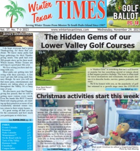 NOVEMBER 29, 2023 www.wintertexantimes.com 2 WINTER TEXAN TIMES 1217 N. Conway Mission, Texas 78572 (956) 580-7800 © Copyright 2023-2024 by Nexus Publishing LLC, all rights reserved. No part of this publication may be reproduced without express written permission of the publisher. The Winter Texan Times is not responsible for errors or omissions in advertising. In the event of an error in an ad or omission of an ad, the newspaper’s financial liability is limited to the cost of the ad in questions. The newspaper is not responsible for any other damages, tangible or intangible. Typically a make-good ad or re-rescheduled ad is considered to sufficiently meet the newspaper’s responsibility. Dan Brunson Publisher dan@wintertexantimes.com Carina Brunson Editor carina@wintertexantimes.com Anastasia Brunson Office Manager anastasia@wintertexantimes.com Published by Nexus Publishing LLC Parks Calendar: Items must be open to the public activities in the parks only and must be submitted by park owners, managers, or activity directors. We do not accept listings for reviews, workshops, lessons, or dance classes. Please include all pertinent information, a contact person, and contact phone number. Submission deadline is Thursday 5 p.m., the week prior to the publication date. Send to Winter Texan Times, 1217 N. Conway Ave., Mission, Texas 78572 or email to parkscal@wintertexantimes.com. News: We are always looking for news about events, organizations, exhibits, fundraising, and more, from parks, chambers, cities, museums, and other venues. You are welcome submit your news items, photos of recent park activities, or news story ideas about your park or park residents. Please include all pertinent information, a contact person, and contact phone number. Submission deadline is Thursday 5 p.m., the week prior to the publication date. Send to Winter Texan Times, 1217 N. Conway Ave., Mission, Texas 78572 or email to news@wintertexantimes.com. Events Calendar: Items must be open to the public. Please include all pertinent information, a contact person, and contact phone number. Submission deadline is Thursday 5 p.m., the week prior to the publication date. Send to Winter Texan Times, 1217 N. Conway Ave., Mission, Texas 78572 or email to news@wintertexantimes.com. Reunions: We feature reunions and meetings that are happening throughout the Valley. We hope that if you are having such a meeting, you will send the information to us so we can help you spread the word. Please include all pertinent information, a contact person, and contact phone number. Submission deadline is Thursday 5 p.m., the week prior to the publication date. Send to Winter Texan Times, 1217 N. Conway Ave., Mission, Texas 78572 or email to reunions@wintertexantimes.com. It’s time to bring out your Santa hats. The City of Edinburg invites the community to join in on the holiday cheer this year at the annual Lighting of the Tree and the Night of Lights Parade. The community is encouraged to mark the start of the holiday season in Edinburg at the Promenade Park Amphitheater (201 W. McIntyre St.) on Thursday, November 30 at 6:30 p.m. for the Lighting of the Tree ceremony. The event features the city’s beautiful 30-foot energy-efficient LED Christmas tree, which will remain illuminated for the remainder of the year for visitors to enjoy, as well as carolers, music performances, and dance presentations. Residents will also be able to get their holiday shopping done early at the Edinburg Christmas Market, immediately following the Lighting of the Tree. Vendors will have Christmas gifts and decor for sale, as well as pictures with Santa. In addition, to emulate an amazing Winter Wonderland, attendees will be able to enjoy a fun snow slide. The following day, on December 1, the Edinburg Chamber of Commerce will host its Night of Lights Parade, beginning at Richard R. Flores Stadium at 7 p.m. The parade route will follow Closner Boulevard from the corner of Mark S. Pena Drive and end at W. McIntyre Street. Spectators can set up chairs along the road for the best view of what is sure to be one of the most wonderful times of the year. Vendors at the Edinburg Christmas Market will reopen from 6 p.m. to 10 p.m. the day of the parade. Both events are free of charge, embracing the spirit of the festive season. Edinburg to kick off holiday season It’s the most wonderful time of year. Mark your calendars and stop by the Upper Valley Art League to see the great selection of items for sale at their 2023 Christmas Fair. UVAL members work all year to create items for this special fair. Artists will be featuring their creativity with original art – perfect for that person who will appreciate a unique gift. There is a wide range of small and large items at reasonable prices. Shop local at UVAL. The fair is open Monday through Thursday 10 a.m. to 6 p.m., Friday and Saturday 10 a.m. to 8 p.m., and closed on Sunday. UVAL is located at 921 E. 12th St. in Mission. Call (956) 591-0282 for more information. You can find out about all of their events by visiting their website at www.uppervalleyartleague.org. UVAL holds Christmas Fair Mayor Richard Molina and Edinburg council members were on the city’s float. Photo by Herb Moering