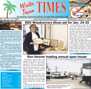 "Let Me Entertain You" pgs. 9-10 See the Wintertainers Winter Texan TIMES Serving Winter Texans From Mission To South Padre Island Since 1987 Vol. 39, No. 11 © 2026 www.wintertexantimes.com Wednesday, January 7, 2026 Ron Hoover will host their 19th Annual Open House next week, Thursday, January 15 and Friday, January 16. The event will be held from 10 a.m. to 3 p.m. on both days. The annual open house is a very popular event in the Rio Grande Valley, drawing in thousands of people each year. Dustin Hoover said this event is the largest attended dealer open house in the nation, in the RV and marine industries. The event has been known to draw in about 10,000 people during the two-day open house. Each year the event hands out free T-shirts (while supplies last), so it’s INDEX Events Calendar p 4 Reunions p 4 Parks Calendar p 8 WintertainersTM p 9 Business Guide p 16 Classifieds p 17 Coupon Index p 18 Taste of the Valley p 19 Rina’s Ramblings See RAMBLINGS pg. 5 Every January for the past 40 years the Rio Grande Valley Woodcarvers has sponsored the premier woodcarving show in South Texas. The Show was held in several locations over the years. From the old McAllen Civic Center to the Pharr Civic Center, then to the Nomad Shrine Club. Last year it was held at the Brookhaven Event Center. This year, the 40th annual Rio Grande Valley Woodcarvers Show will be held on January 24 and 25 in a brand-new location. The Rio Grande Valley Woodcarvers Show will be held at the Palm View Community Center. It will be held on Friday, January 24, from 9 a.m. to See WOODCARVERS pg. 5 RGV Woodcarvers Show set for Jan. 24-25 Ron Hoover hosting annual open house Happy New Year to everyone! I hope you had a safe and fun one. I know lots of parks had sold out dances and entertainment for New Year’s Eve. I am sure everyone had a blast, and it is evident by the many photos I have seen on Facebook. And then there was the New Year’s Day Polar Bear Plunge. I saw a video of the hundreds that joined in at South Padre Island. I also saw a few parks that used their own swimming pool to hold the event. I also saw photos of people taking their First Day Hike at several of the parks in the Valley. It was a delight to see everyone involved in something that the Valley has to offer – whether it be our great weather, entertainment, island, or our parks. The Valley has a lot to offer See RON HOOVER pg. 3 A woodcarver shows her work at the RGV Woodcarvers Show. (Photo by Henry Miller) Visitors walk around the fifth wheels and park models at the Ron Hoover Open House. (Photo by Carina A. Brunson)